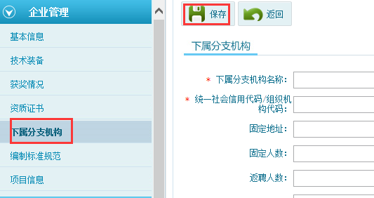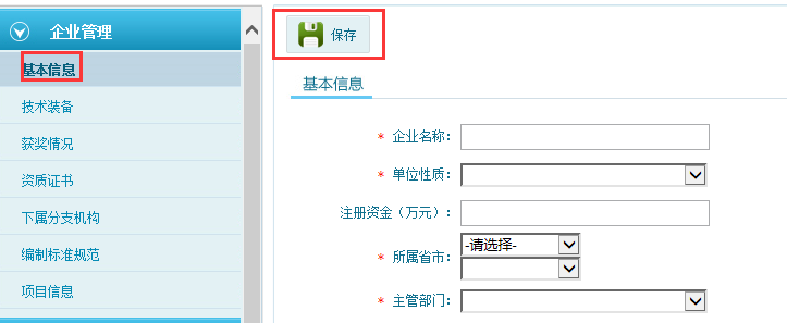 第一步:點(diǎn)擊企業(yè)管理—基本信息,右則顯示出企業(yè)基本信息填寫頁面,將帶星號的內(nèi)容填寫完整,點(diǎn)擊“保存”按鈕,如圖6-1-1: