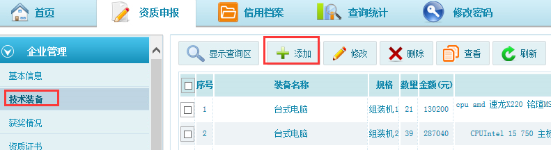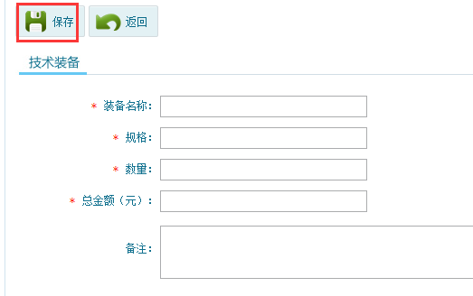 第二步:點(diǎn)擊技術(shù)裝備模塊,此模塊填寫單位所擁有的裝備信息,點(diǎn)擊添加按鈕,填寫裝備信息內(nèi)容,如圖6-1-2,6-1-3,添加完成后點(diǎn)擊“保存”按鈕。