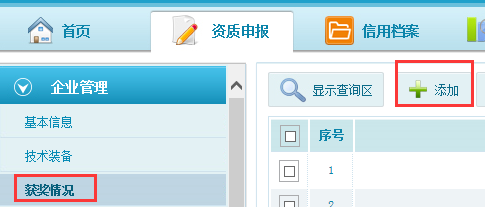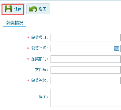 第三步:點(diǎn)擊獲獎(jiǎng)情況模塊,此模塊填寫單位所擁有的獲獎(jiǎng)情況信息,點(diǎn)擊添加按鈕,填寫內(nèi)容,如圖6-1-4,6-1-5,添加完成后點(diǎn)擊“保存”按鈕。