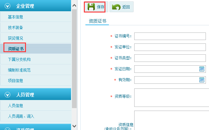 第四步:點(diǎn)擊資質(zhì)證書模塊,點(diǎn)擊添加按鈕,填寫內(nèi)容,如圖6-1-6,添加完成后點(diǎn)擊“保存”按鈕。