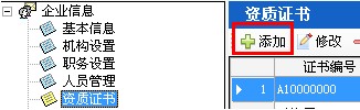 第一步:點擊“企業(yè)信息-資質(zhì)證書”模塊,點擊添加按鈕,添加資質(zhì)證書信息(如圖11-1):