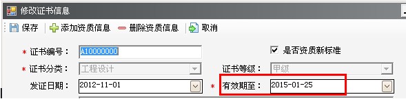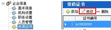 第一步:點擊“企業(yè)信息-資質(zhì)證書”模塊,選中資質(zhì)證書,點擊“修改”按鈕(如圖11-2),檢查資質(zhì)證書是否在有效期內(nèi),修改完成之后保存(如圖11-3):