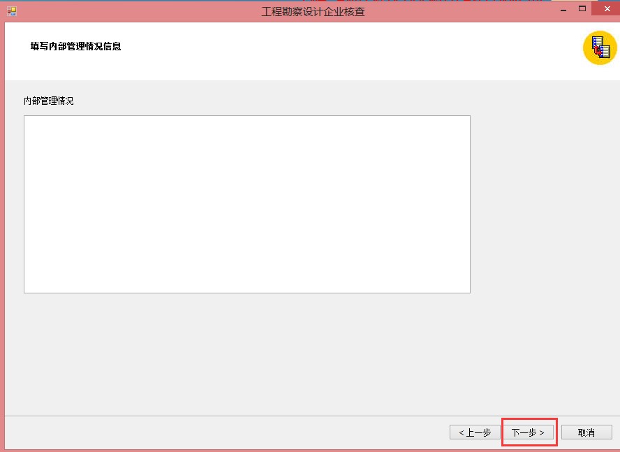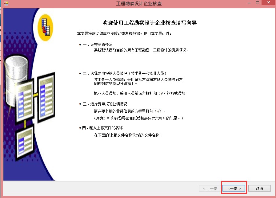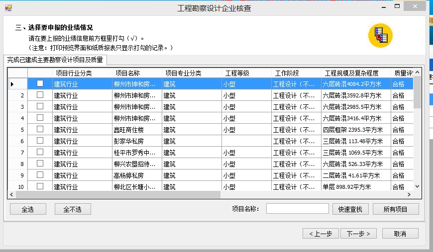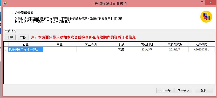 6、點(diǎn)擊“下一步”,進(jìn)入企業(yè)資質(zhì)情況窗口,企業(yè)資質(zhì)情況界面自動(dòng)提取證書打印系統(tǒng)中的資質(zhì)信息(數(shù)據(jù)來源:證書打印庫),資質(zhì)情況不允許修改,并且本頁面只顯示參加本次資質(zhì)檢查和在有效期內(nèi)的資質(zhì)證書信息。