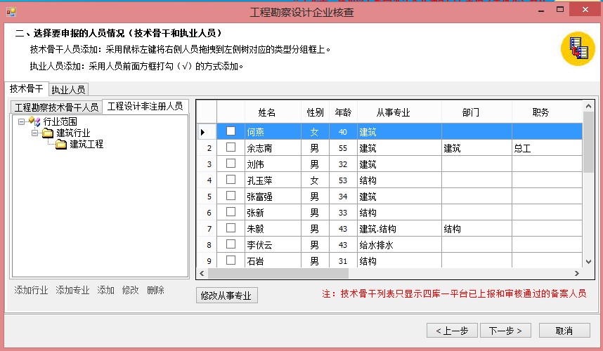 7、資質(zhì)信息下一步,彈出“選擇要申報(bào)的人員情況(技術(shù)骨干和執(zhí)業(yè)人員)”界面,技術(shù)骨干頁面人員列表中采取鼠標(biāo)左鍵拖拽方式,拖動(dòng)到左邊相應(yīng)的專業(yè)上面,執(zhí)業(yè)人員則進(jìn)行勾選方式選擇。