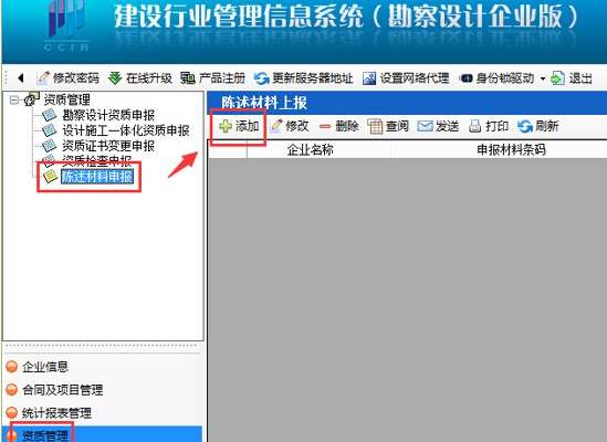 第一步:登錄EI5.0系統(tǒng)點(diǎn)擊資質(zhì)管理——陳述材料申報(bào)——添加。如圖32-2-1: