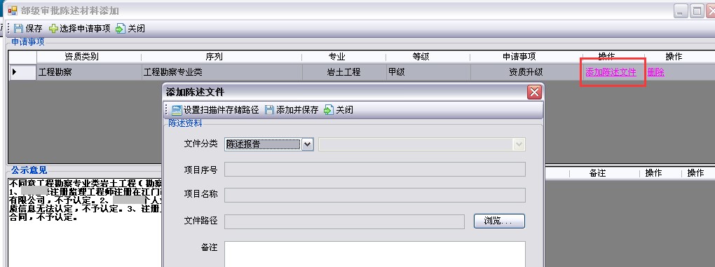 第五步:先設(shè)置掃描件存儲(chǔ)路徑,在彈出的對(duì)話框中選擇本地路徑。“文件分類”字段先選擇陳述報(bào)告,“文件路徑”選擇陳述報(bào)告掃描件,備注中添加陳述報(bào)告文字描述內(nèi)容。添加完成后,點(diǎn)擊“添加并保存”。如圖32-2-5