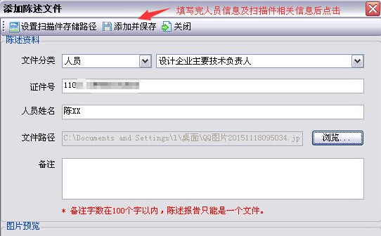 第六步:若需要進(jìn)行人員陳述,則“文件分類”選擇人員,然后繼續(xù)選擇人員類型,填寫證件號(hào)、人員姓名等信息,“文件路徑”選擇此人證件圖片,添加完成后點(diǎn)擊“添加并保存”按鈕,若需要添加此人多張證件圖片,則不需要關(guān)閉添加陳述文件窗口,繼續(xù)點(diǎn)擊“文件路徑”瀏覽,則會(huì)繼續(xù)添加此人的證件圖片。如圖:32-2-6