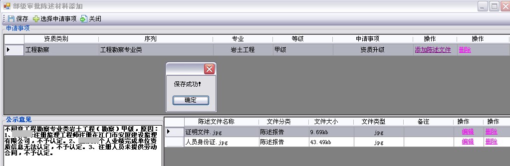第七步:所有陳述材料添加完成后,點(diǎn)擊菜單欄上的“保存”按鈕,系統(tǒng)提示“保存成功”,點(diǎn)擊確定后,回到陳述材料上報(bào)窗口,如圖32-2-7