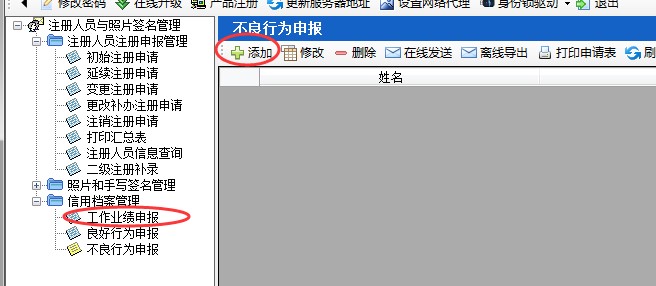 第一步:點擊“注冊人員與照片簽名管理-信用檔案管理-工作業(yè)績申報”模塊,然后點擊“添加”按鈕(如圖);