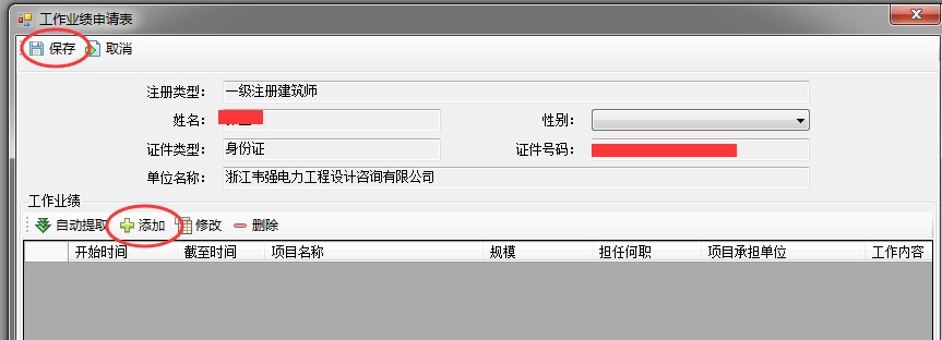 第三步:在彈出的“工作業(yè)績申請表”界面點擊“添加”按鈕,進行信息填寫,填寫后點擊“保存”按鈕(如圖);