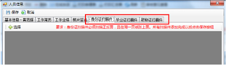 第六步:點(diǎn)擊“身份證掃描件”、“畢業(yè)證掃描件”、“職稱掃描件”分欄,分別對(duì)相關(guān)掃描件進(jìn)行選擇,然后點(diǎn)擊“保存”,如圖29-2-6: