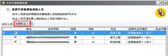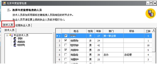 6、點(diǎn)擊“下一步”在第三項(xiàng)“選擇年度監(jiān)督檢查人員”中拖選技術(shù)人員到相應(yīng)樹節(jié)點(diǎn)中(如圖20-81),并在所需上報(bào)執(zhí)業(yè)信息前打“√”(如圖20-82):