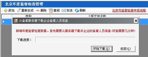 1、點(diǎn)擊“資質(zhì)管理”子模塊中的“北京市監(jiān)督檢查申報(bào)”,點(diǎn)擊“添加”按鈕,彈出下載備案人員信息的界面(如圖20-76):