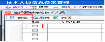 第三步:點擊“添加”→“選擇要新聘的技術(shù)人員”,彈出人員選擇列表,將需要備案的技術(shù)人員勾選,點擊“確定”,如圖28-2-3: