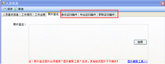 第六步:分別點擊“身份證掃描件”、“畢業(yè)證掃描件”、“職稱掃描件”分欄,按要求選擇相關(guān)的掃描件,然后點擊“保存”,如圖28-2-6: