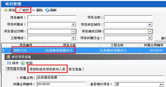 第一步:點擊“合同及項目管理-勘察設計項目管理”模塊,選中項目點擊修改,在修改界面填寫項目階段(如圖22-4-3):