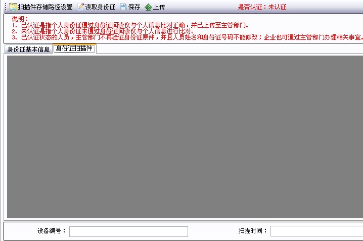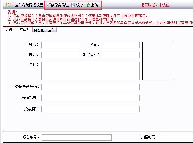 第三步:把要掃描的身份證放在閱讀儀的掃描區(qū)域上,點擊讀取身份證,讀取身份證信息后單擊保存。(如圖1-3,1-4)