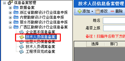 第二步:點(diǎn)擊“信息備案管理--廣西區(qū)勘察設(shè)計(jì)行業(yè)信息備案--技術(shù)人員信息備案”,彈出技術(shù)人員信息備案界面,如圖24-2-2: