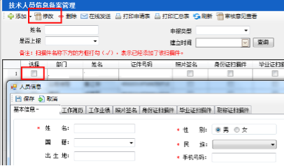 第四步:選擇人員后回到技術(shù)人員信息備案界面,選中人員點(diǎn)擊菜單欄“修改”,彈出該人員信息對(duì)話框,完善基本信息、工作簡(jiǎn)歷、工作業(yè)績(jī)等內(nèi)容,如圖24-2-4: