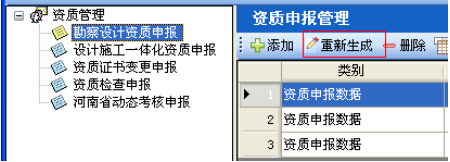 第一步:點(diǎn)擊“資質(zhì)管理”模塊-勘察設(shè)計(jì)資質(zhì)申報(bào)-選中要申報(bào)的資質(zhì)-“重新生成”(如圖7-26):