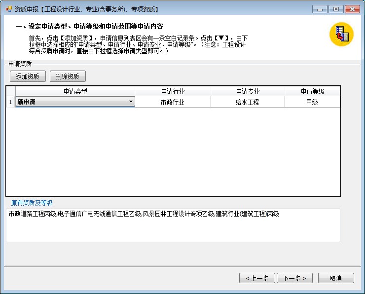 第一步:勘察設(shè)計(jì)資質(zhì)申報(bào)點(diǎn)擊添加彈出資質(zhì)申請(qǐng)向?qū)В鐖D7-16-1。