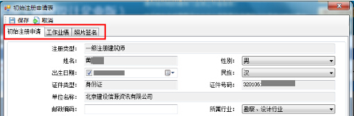 第五步:彈出初始注冊(cè)申請(qǐng)表界面,完善“初始注冊(cè)申請(qǐng)、工作業(yè)績、照片簽名”內(nèi)容,然后點(diǎn)擊“保存”(如圖12-9-3):