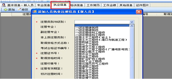 第一步:點(diǎn)開“企業(yè)信息-人員管理”模塊,在“單位人員集合”中找到相應(yīng)人員姓名,點(diǎn)擊打開,在執(zhí)業(yè)信息欄內(nèi)填寫注冊(cè)人員信息即可。(如圖24-8-4):