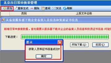 2、點(diǎn)擊“北京市日常申換章管理”的“添加”按妞,彈出備案人員信息和資質(zhì)證書信息內(nèi)容,點(diǎn)擊開始下載,下載后提示獲取人員和證書信息成功(如圖20-194):