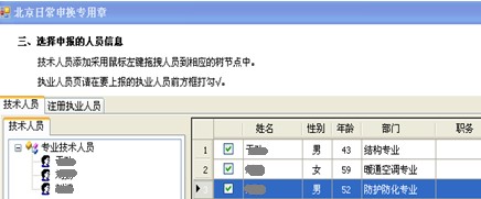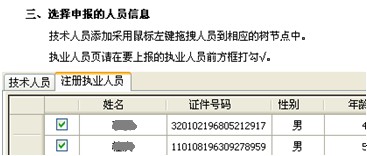 6、點(diǎn)擊“下一步”,選擇要申報(bào)的人員信息。技術(shù)骨干人員采用拖拽到相應(yīng)的節(jié)點(diǎn)方式(如圖:20-198)執(zhí)業(yè)人員在選擇的人員面前打“√”即可(如圖20-199):