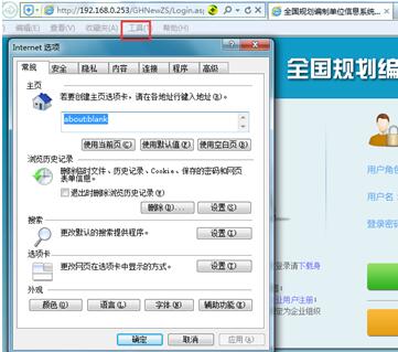 第一步:點(diǎn)擊瀏覽器菜單欄“工具”按鈕,找到二級(jí)菜單功能“Internet選項(xiàng)”,彈出“Internet選項(xiàng)”設(shè)置對(duì)話框,如圖1-1-1:
