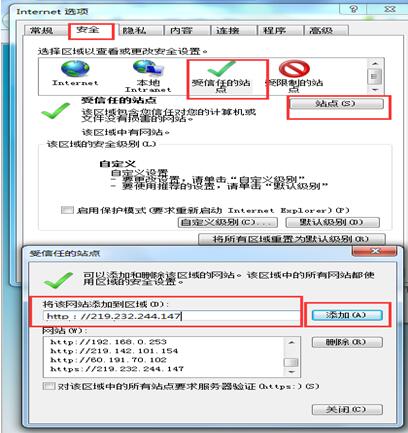 第二步:點(diǎn)擊“安全”-“可信站點(diǎn)”-“站點(diǎn)”彈出“可信站點(diǎn)”對(duì)話框,將規(guī)劃服務(wù)器地址加入到區(qū)域中,并且將下方的“對(duì)該區(qū)域中的所有站點(diǎn)要求服務(wù)器驗(yàn)證(https:)(s)”前的對(duì)勾去掉,點(diǎn)擊“添加”按鈕,如圖:1-1-2: