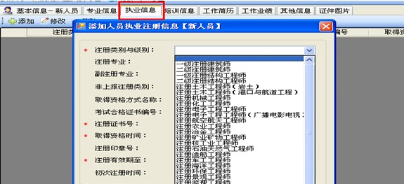 第一步:點開“企業(yè)信息-人員管理”模塊,在“單位人員集合”中找到相應人員姓名,點擊打開,在執(zhí)業(yè)信息欄內填寫注冊人員信息(如圖10-5):
