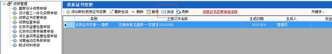 生成資質證書變更申報的數(shù)據(jù)后,點擊上方發(fā)送按鈕,如圖