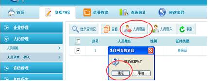 第二步:勾選人員,點(diǎn)擊“人員調(diào)離”,系統(tǒng)彈出確認(rèn)對話框。如圖3-2-2