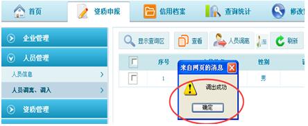第三步:點(diǎn)擊“確定”后,系統(tǒng)彈出提示“調(diào)出成功”即為成功調(diào)離該人員。如圖3-2-3