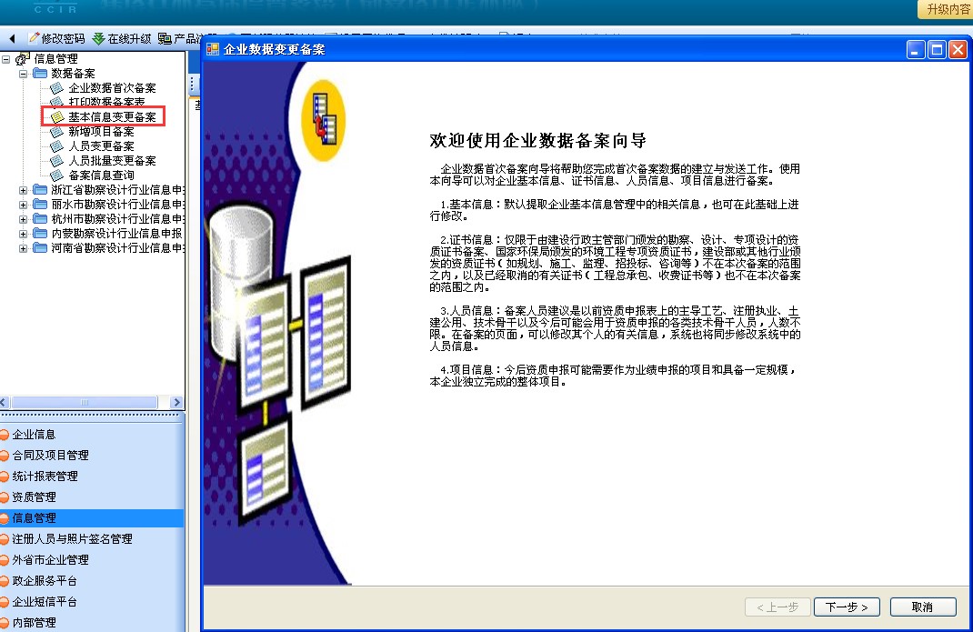 第二步:點(diǎn)擊“信息管理—數(shù)據(jù)備案—基本信息變更備案”模塊,則會彈出數(shù)據(jù)備案向?qū)?。(如圖11-9-2)