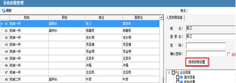 第三步:點擊“系統(tǒng)管理”-“用戶權(quán)限管理”-選中個人信息,在右側(cè)設(shè)置“登陸用戶名”、“登陸密碼”“分配模塊的使用權(quán)限”,設(shè)置完成后,點擊“保存權(quán)限設(shè)置”按鈕(如圖2-16)