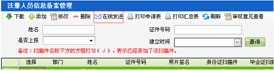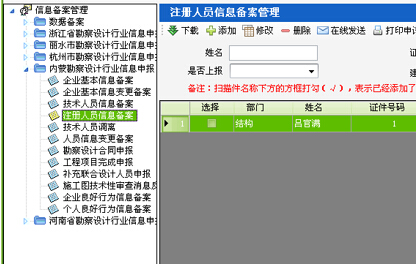 第四步:完善人員信息后,在注冊人員信息備案界面,選擇完善后的人員信息,點(diǎn)擊“在線發(fā)送”按鈕,完成勘察設(shè)計(jì)注冊人員信息備案,如圖28-3-4: