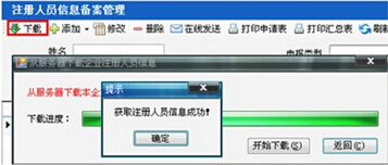 第二步:點(diǎn)擊菜單欄“下載”按鈕彈出注冊人員下載窗口,點(diǎn)擊在線下載,彈出注冊人員獲取成功,如圖28-3-2: