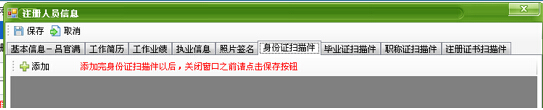 第三步:選擇獲取成功的注冊人員信息,點(diǎn)擊菜單欄“修改”,彈出注冊人員信息界面,完善該注冊人員的“身份證掃描件”、“畢業(yè)證掃描件”、“職稱證掃描件”、“注冊證書掃描件”,然后點(diǎn)擊“保存”,如圖28-3-3: